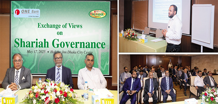 ONE Bank PLC arranged a day long program titled “Exchange of Views on Shariah Governance” on May 17, 2025 at Hotel Holiday Inn, Dhaka City Centre. Mr. Shabbir Ahmed, Managing Director (Current Charge) formally inaugurated the program. Mr. Abu Zafore Md. Saleh, Additional Managing Director, delivered his welcome speech. Mr. Mohammad Zakir Hossain, Additional Director and Mr. Aftab Uddin, Deputy Director, Islamic Banking Regulation and Policy Department, Bangladesh Bank were present as special guests in the event. They also conducted important sessions on Islamic Banking. Senior Executives and Zonal Heads of the Bank were present in the program and exchanged their valuable views.