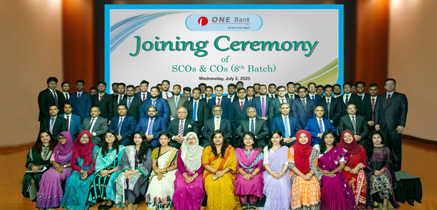 54 Special Cadre Officers and Cadre Officers (8th Batch) of ONE Bank PLC joined the Bank on July 02, 2025. On this occasion, a day-long onboarding program was held. Mr. Shabbir Ahmed, Managing Director (Current Charge), Mr. Abu Zafore Md. Saleh, AMD & Head of Islami Banking, Mr. John Sarkar, DMD, Company Secretary & Head of HR, Mr. Md. Anwarul Islam, DMD, Chief Legal Officer & Head of Recovery Division, Mr. Monzurul Alam Chowdhury, ADMD, Chief Risk Officer & CAMLCO, Mr. Manirul Islam, ADMD & Head of CRM delivered speeches and welcomed the future leaders.