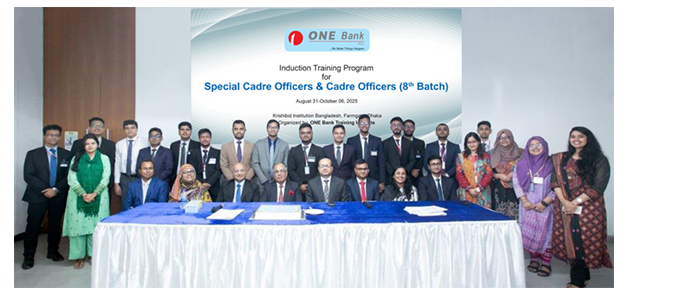 ONE Bank arranged the valedictory and certificate distribution ceremony of one month long “Induction Training Program for Special Cadre Officers (SCOs) & Cadre Officers (COs) 8th Batch” for the newly recruited SCOs and COs at Krishibid Institution Bangladesh, Farmgate, Dhaka on October 05, 2025.